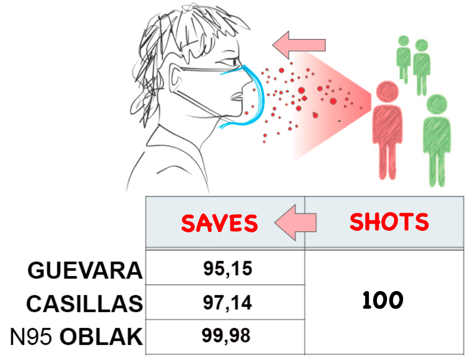 Recently, a group of Chinese scientists corrected the ball-size problem using a virus of the same shape and size as SARS-CoV-2 to study its ability to cross different types of masks 9. In this publication, Jan Oblak, as expected, had an extraordinary performance. FPP3 Oblak cut 99.98% of the micrometre balloons. The good news is that the surgical mask caught 97.14% of the spherical viruses. The performance of the surgical mask was much better than expected. It was something like selecting Iker Casillas as a goalkeeper, and he played a great game despite his recent retirement. So, all in all, a pleasant surprise, but not so strange either.