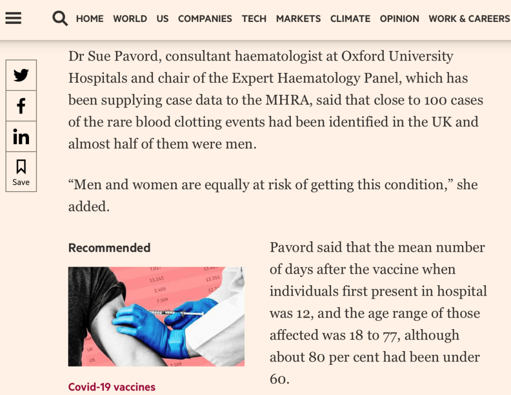 La agencia reguladora del medicamento británica (MHRA) publicó el 7 de abril de 2021 una nota diciendo que había una POSIBLE relación entre la vacunación con Vaxzevria y unos trombos sanguíneos EXTREMADAMENTE INFRECUENTES que coincidían con un nivel de plaquetas sanguíneas bajas.