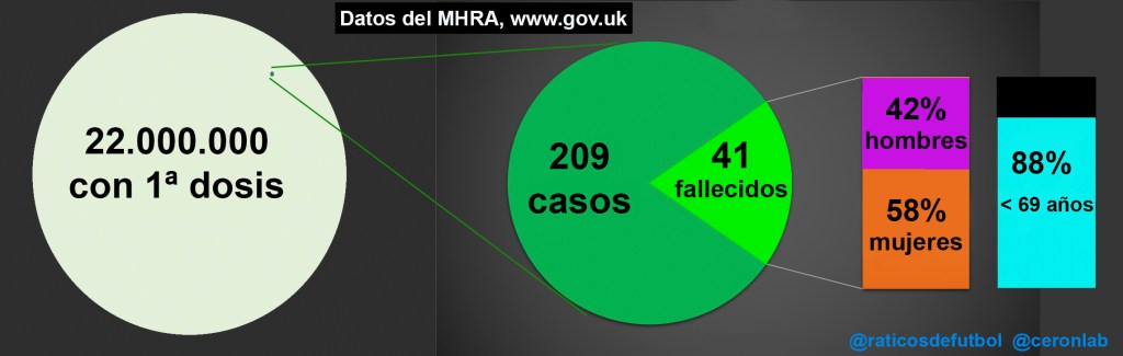 Actualización 1 de Mayo. Un informe actualizado de la agencia británica MHRA habla de 209 de «trombos raros» en personas con la primera dosis de la vacuna de AstraZeneca. De estos casos, fallecieron 41, sin grandes sesgos entre hombres y mujeres pero sí en cuanto a la edad. El 88% de los casos eran menores de 69 años, y el 73% de los casos menores de 60.