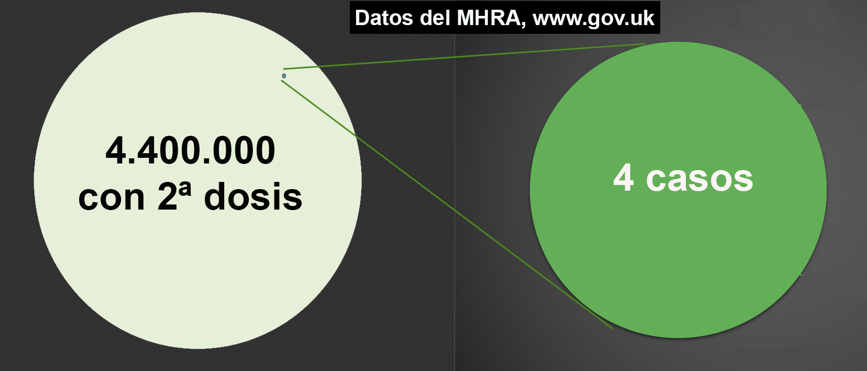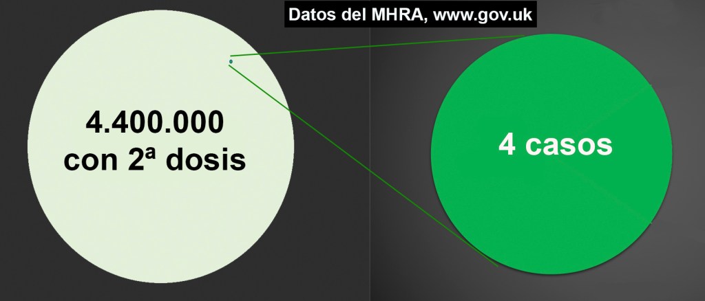 De 20,2 millones de vacunados con la vacuna de Astrazeneca, en el Reino Unido se han notificado 79 casos de estos trombos raros. De estas 79 personas, fallecieron 19. Así que aproximadamente, por cada millón de personas vacunadas con Astrazeneca cuatro sufrieron estos trombos y una falleció. Dicho de otro modo, una persona fallecida por millón de vacunados.